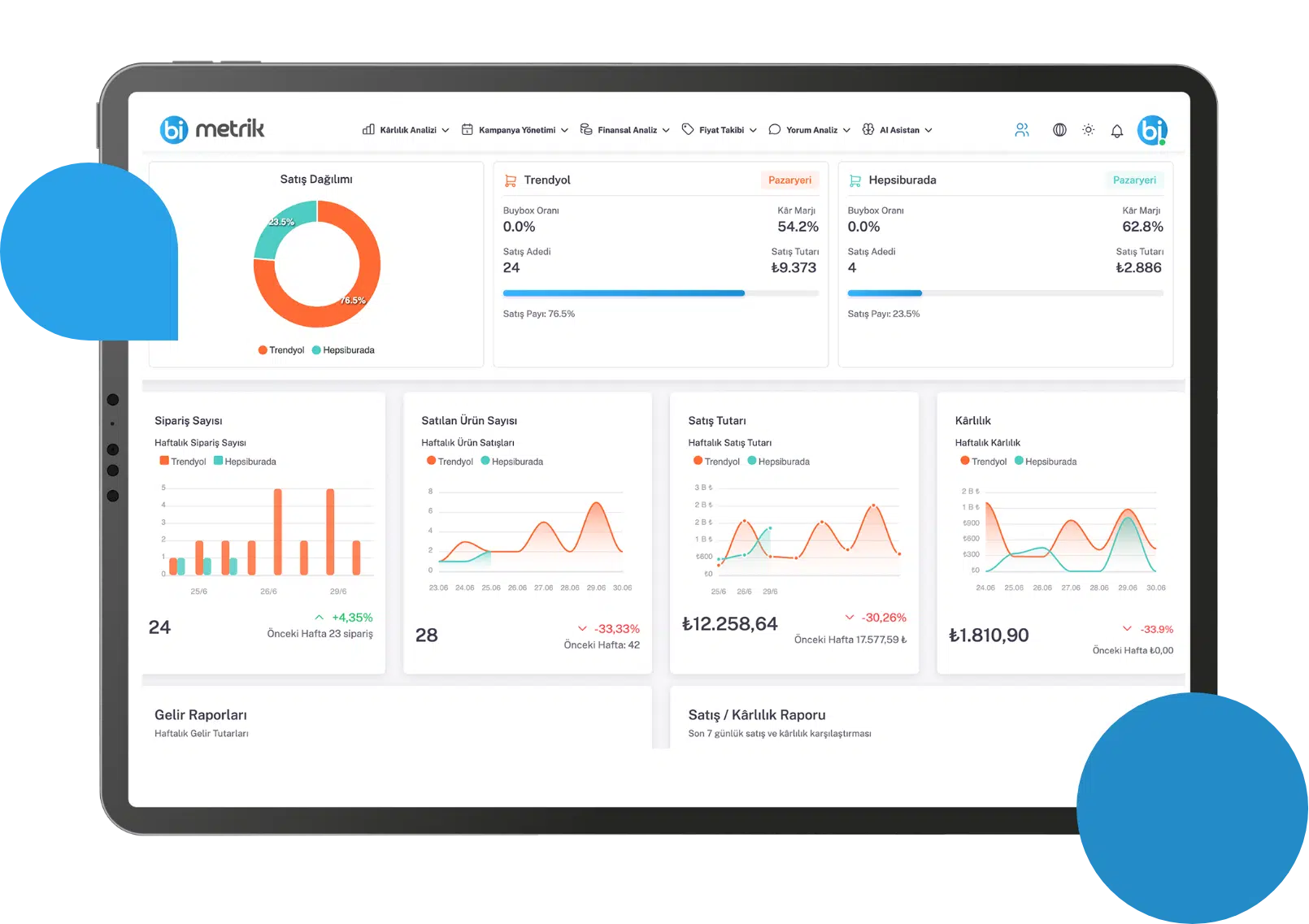 Bimetrik, e-ticaret işletmeleri için geliştirilmiş, yapay zeka destekli bir analitik ve yönetim platformudur. Sloganı olan “Verilerle boğuşan değil, onları yöneten işletmeler kazanır” felsefesiyle yola çıkan platform, karmaşık e-ticaret operasyonlarını tek bir noktadan, akıllı içgörülerle yönetmenizi sağlar.